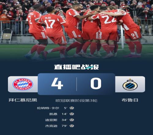拜仁4-0橫掃布魯日,拜仁方面各賽事12連勝!本場凱恩破門,卡爾世界波,萊默爾造三球,杰克遜、迪亞斯建功。